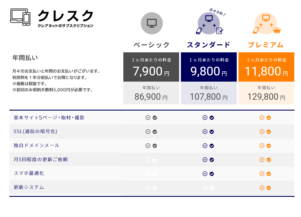 月々7,900円だけでサービスを利用できます。今後の追加費用も、ご自分での作業も、必要なしで安心です。時間かかるとか面倒とかは誰しもが嫌なもの、ほぼクレアネットのクレスクサービスに丸投げしてもらえればOKです。